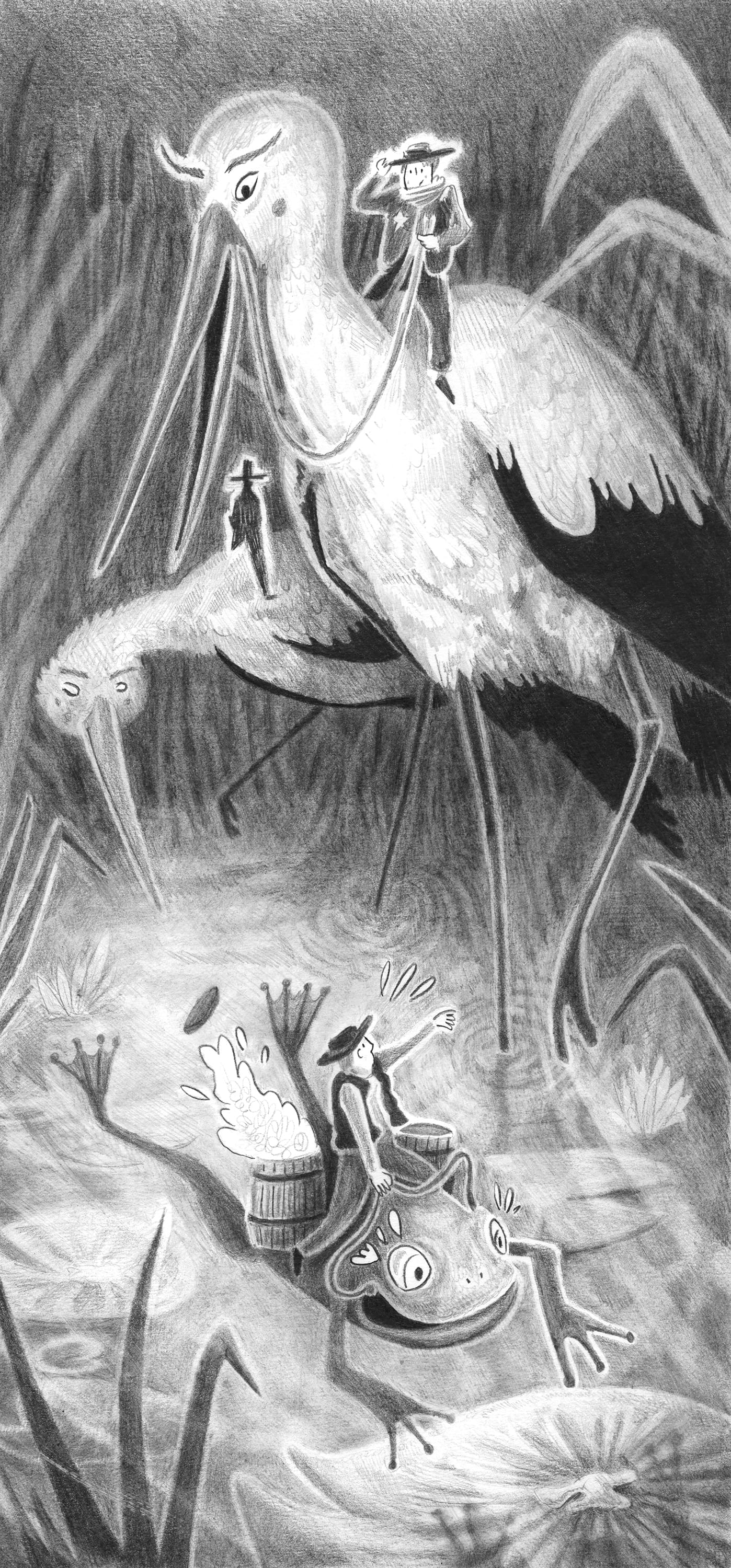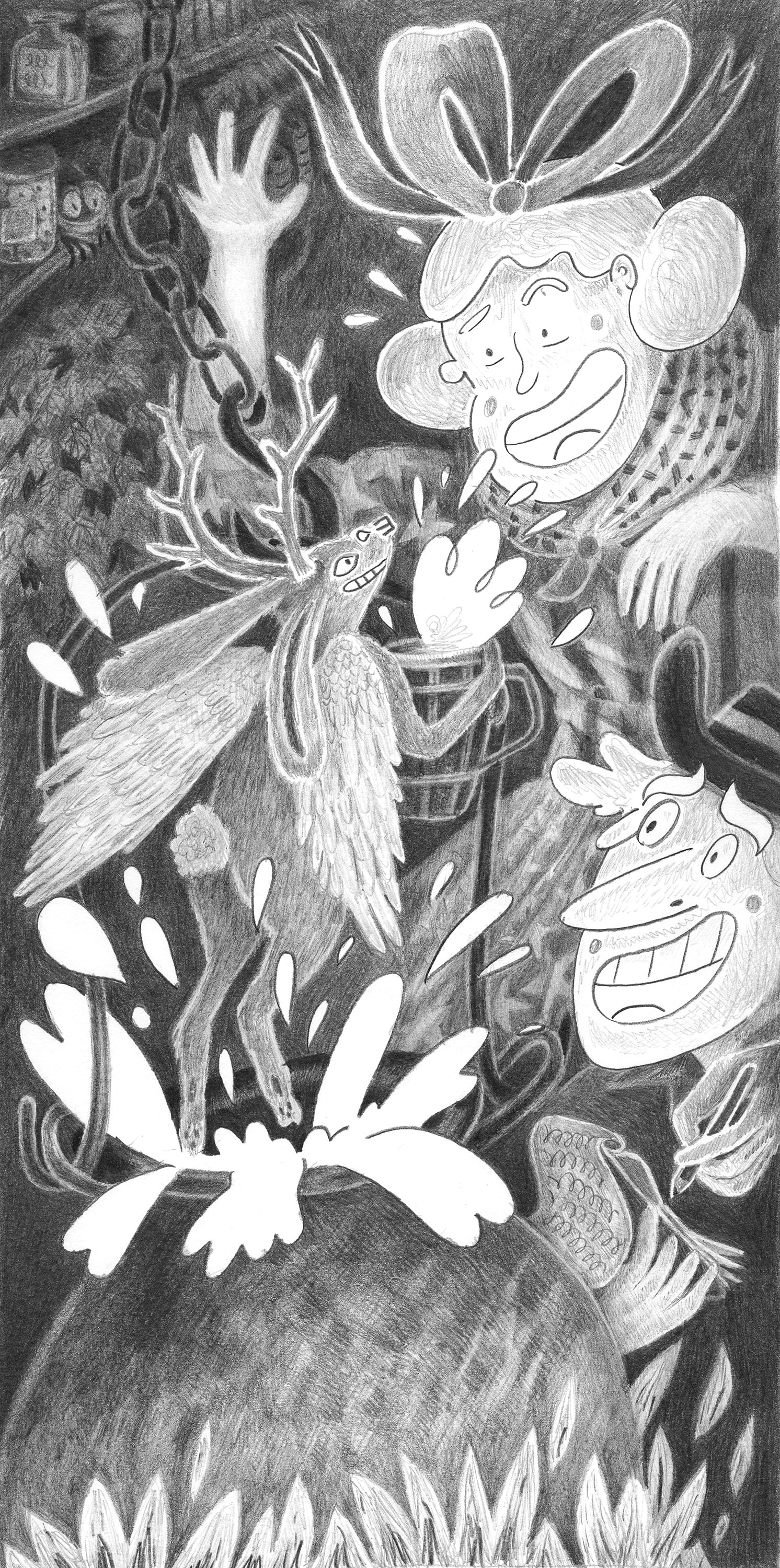 Wolpertinger & chaudron de bière, crayon sur papier 2022, 42 x 28 cm